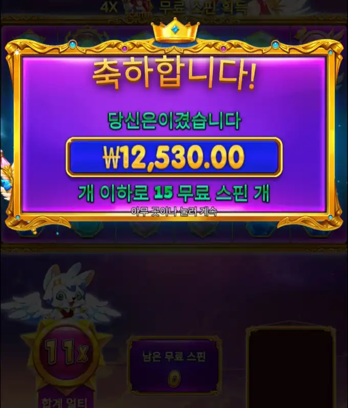 슬롯 플레이 도중 나온 실제 당첨내역 이미지입니다. 당첨금 ₩12,530.00 / 배당 11x. 심볼도 좀 잘맞춰주지.. - 슬롯게임 리뷰. 결론 안주네... 아.. 아침부터 뚜껑열린다..
