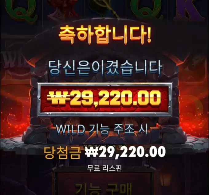 슬롯 플레이 장면 중 핵심 당첨 구간을 보여주는 이미지로, 당첨금 ₩29,220.00 정보가 같이 보입니다. 축하합니다! 당신은 이겼습니다. 당첨금 ₩29,220.00